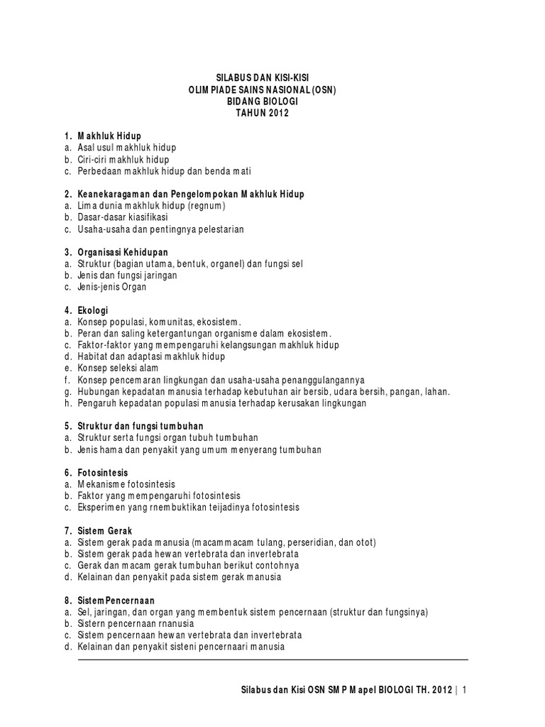 Seputar osn, silabus osn biologi, referensi serta tips dan trik. Untuk menambah pengetahuan bagi siswa siswi sma yang akan mengikuti osn 2018, berikut ini silabus olimpiade sains nasional (osn) 2018 jenjang sma untuk semua bidang. Urip.info topik yang sebagian besar terdapat pada kurikulum nasional. Namun, berbeda dengan bidang osn lain seperti fisika, matematika, kimia dan biologi, bidang informatika khususnya pemrograman belum menjadi. Silabus biologi yang terbaru ini mengakomodasi kemampuan yang diperlukan bagi pengembangan kemampuan yang diperlukan di abad 21, yaitu: Diharapkan silabus osn ksn smp tahun 2020 ini dapat menjadi panduan dan berfungsi menyatukan pemahaman dan menyamakan interpretasi para guru dan pembina dalam menyiapkan peserta didik. Silabus osn ini tidak jauh berbeda dengan silbus osn pada tahun lalu, silahkan disimak kembali silabus osn tahun 2017 (disini)]. Lihat silabus osn biologi di sini. Diktat perencanaan pembelajaran pak converted pages 1 33 text. Materi osn biologi secara umum telah tercantum dalam kurikulum mata pelajaran biologi di tingkat. Silabus osn smp 2014 ii milik negara tidak diperdagangkan agar osn dapat dilaksanakan dengan baik, maka direktorat pembinaan sekolah menengah pertama menerbitkan silabus. Silabus osn tingkat sekolah menengah atas untuk bidang biologi dapat diunduh pada tautan berikut: Silabus olimpiade sains nasional (osn) smp tahun 2019 memuat melalui osn smp mampu memberikan ruang belajar, memfasilitasi dan menstimulus siswa dan guru yang berprestasi.